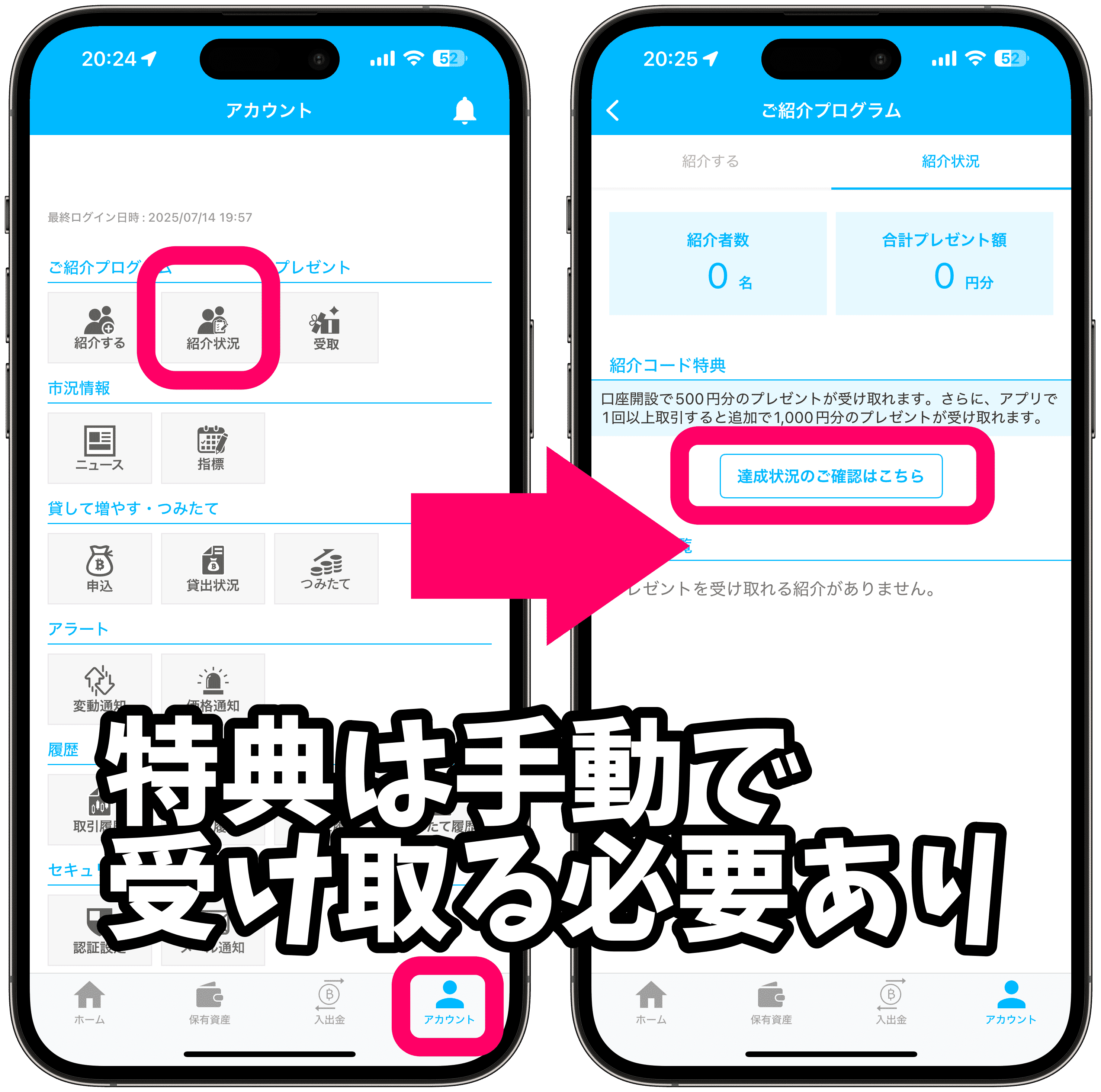 アプリ右下「アカウント」→「紹介状況」→「達成状況の確認はこちら」から、紹介報酬や取引報酬を受け取ることができます。