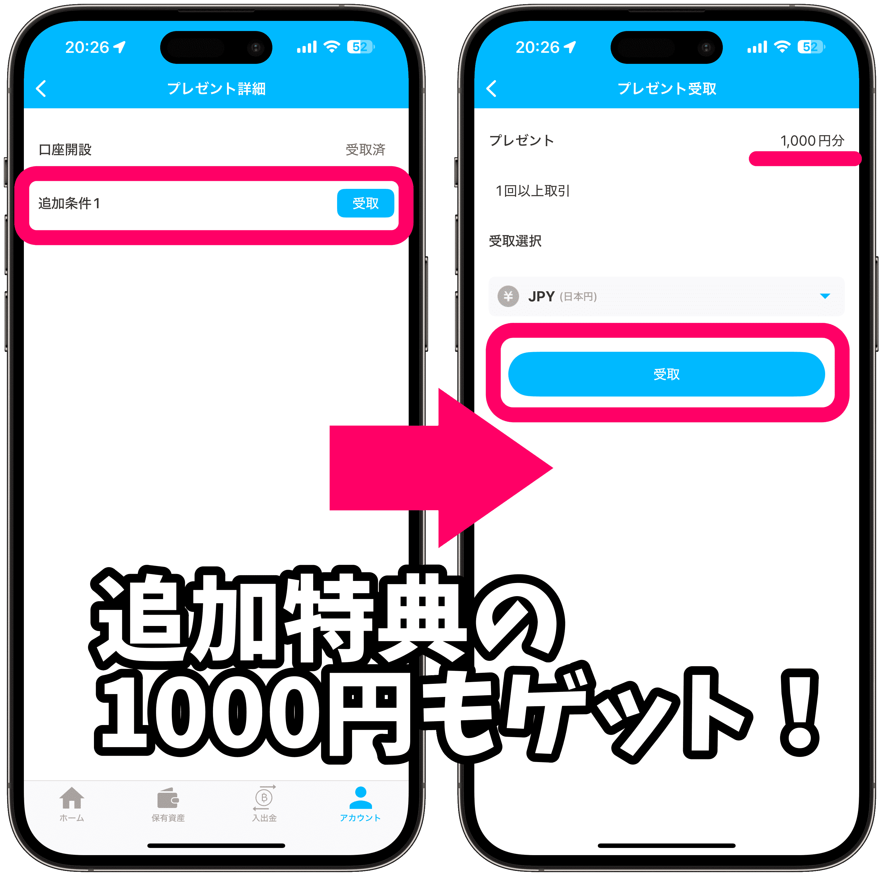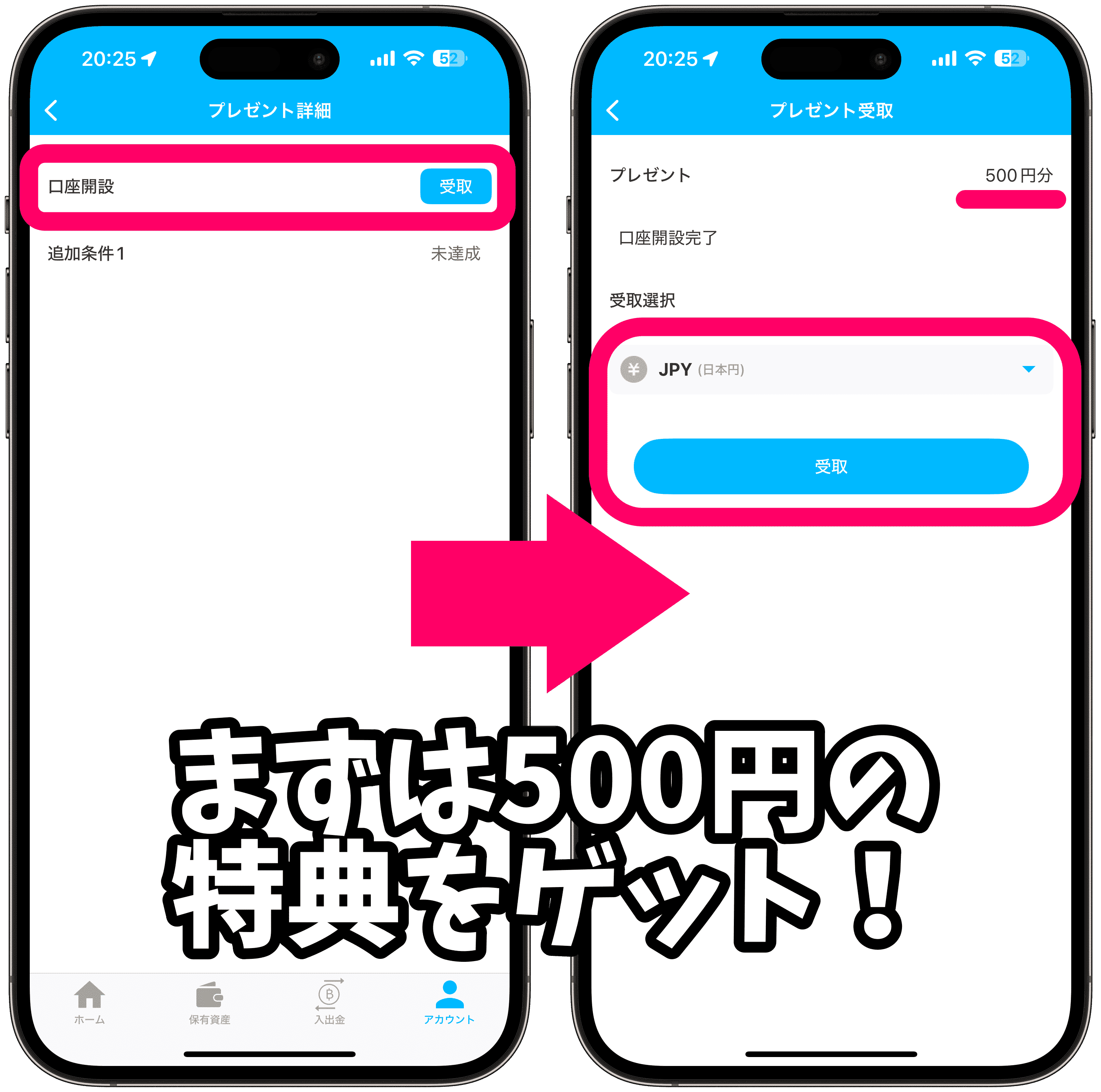 口座開設「受取」をタップすると、500円分の特典を受け取れます。